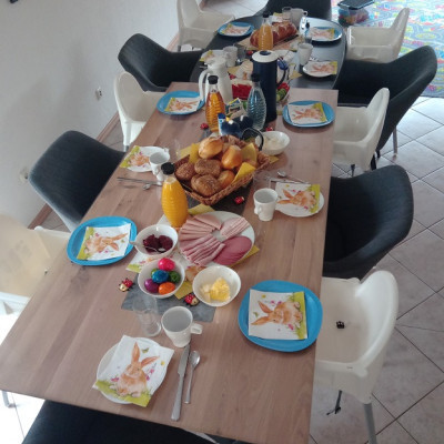 An Gründonnerstag haben wir mit allen Mamas und den Zwergen ein tolles gemeinsames Osterfrühstück gemacht. Nachdem wir es uns haben schmecken lassen konnten die Zwerge im Garten nach Überraschungen vom Osterhasen suchen...